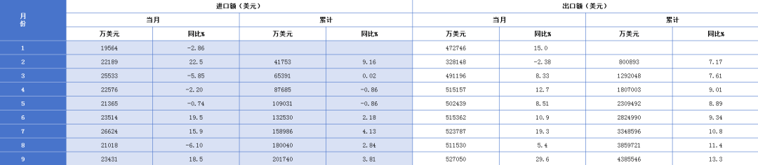 三季度合计出口156.06亿美元,同比增长21.2%;进口6.92亿美元,同比增长7.08%。