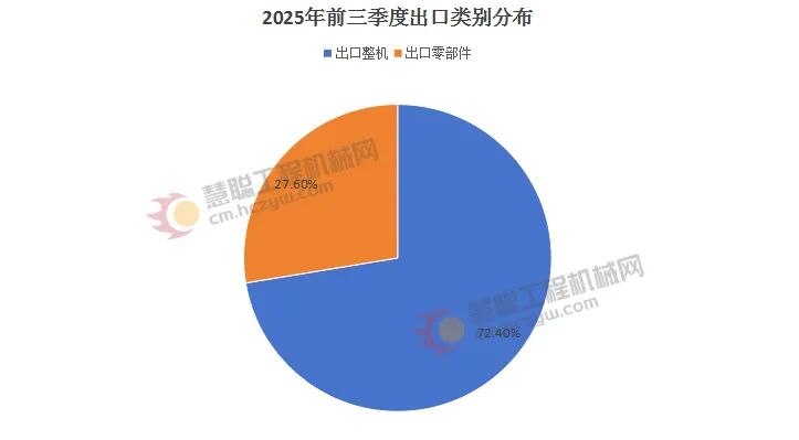 2025年前三季度,工程机械累计出口整机317.55亿美元,同比增长13.1%,占出口总额的72.4%;零部件出口121亿美元,同比增长13.8%,占出口总额的27.6%。