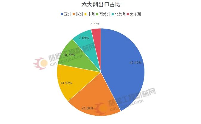 对六大洲出口中,出口占比从大到小依次为:亚洲占42.42%、欧洲占21.04%、非洲占14.53%、南美洲占10.77%、北美洲占7.69%、大洋洲占3.55%。