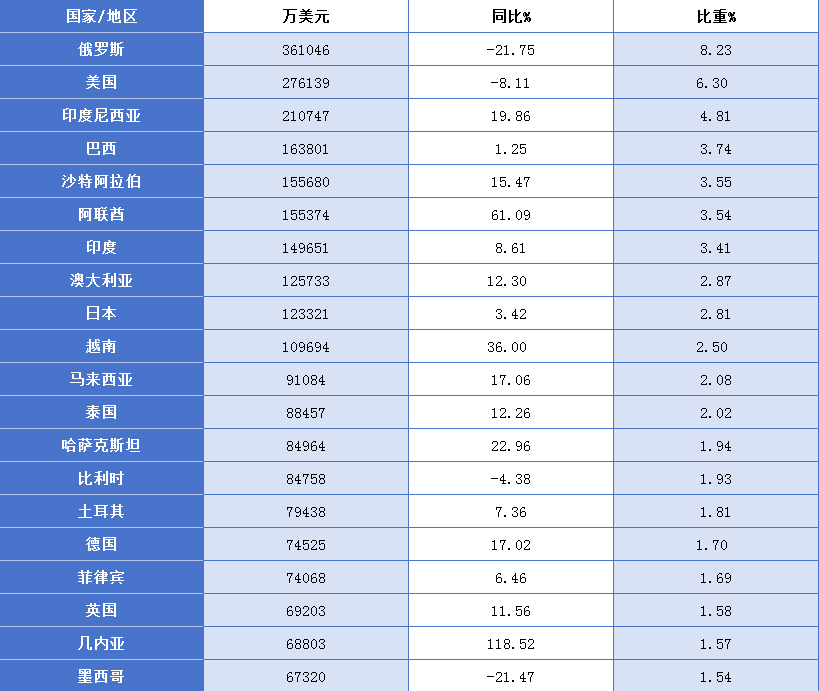 向俄罗斯联邦、美国、印度尼西亚、巴西、沙特阿拉伯、阿联酋、印度、澳大利亚等二十个国家和地区出口合计261.38亿美元,占全部出口额的59.6%。(前三季度我国工程机械出口额排名前二十的国家以及出口额、同比变化、所占比重如下表)