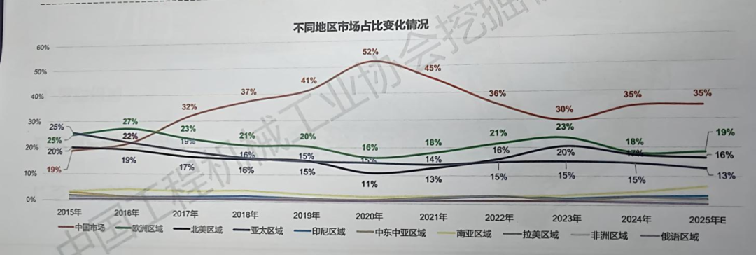 中国市场以35%份额拔得头筹,这得益于国内工程机械市场筑底回暖态势渐明,挖机销售量逐步回升。