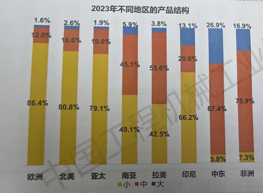 拉美:小型挖掘机42.5%,中型挖掘机53.6%,大型挖掘机3.8%。