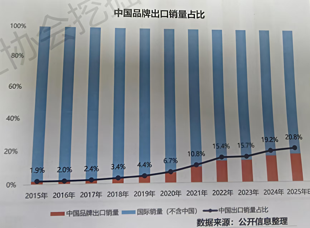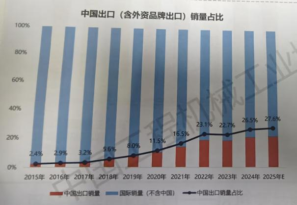 历经10余年发展,如今中国正逐渐成为挖掘机械重要制造基地,各制造商充分依托中国的产业优势,向全球输出中国制造的产品,预估2025年中国出口销量占国际市场(不含中国)销量的比例将达到27%左右,10年时间增长超10倍。中国品牌的出口销量占国际市场(不含中国)销量的比例,预估也将超过20%,国际市场仍有一定发展空间。