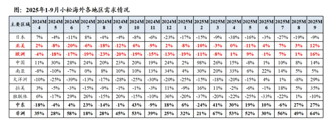 需求端的改善更为直观,小松披露的土方机械销量数据显示,北美、欧洲、大洋洲的需求同比增速分别于2025年7 月、5月、6月相继转正。
