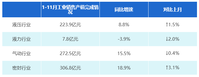 1-11月行业工业销售产值完成880.6亿元,同比增长15.8%。其中:液气密销售产值完成811.0亿元,同比增长14.6%。分行业情况: