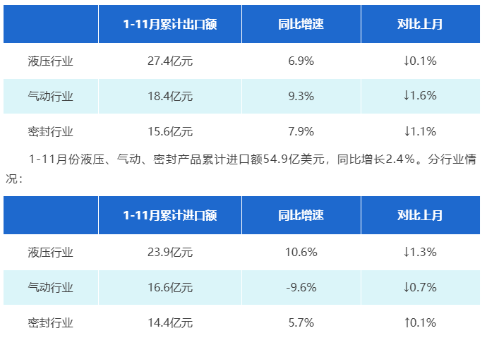 1-11月份液压、气动、密封产品累计出口额61.4亿美元,同比增长7.9%。分行业情况: