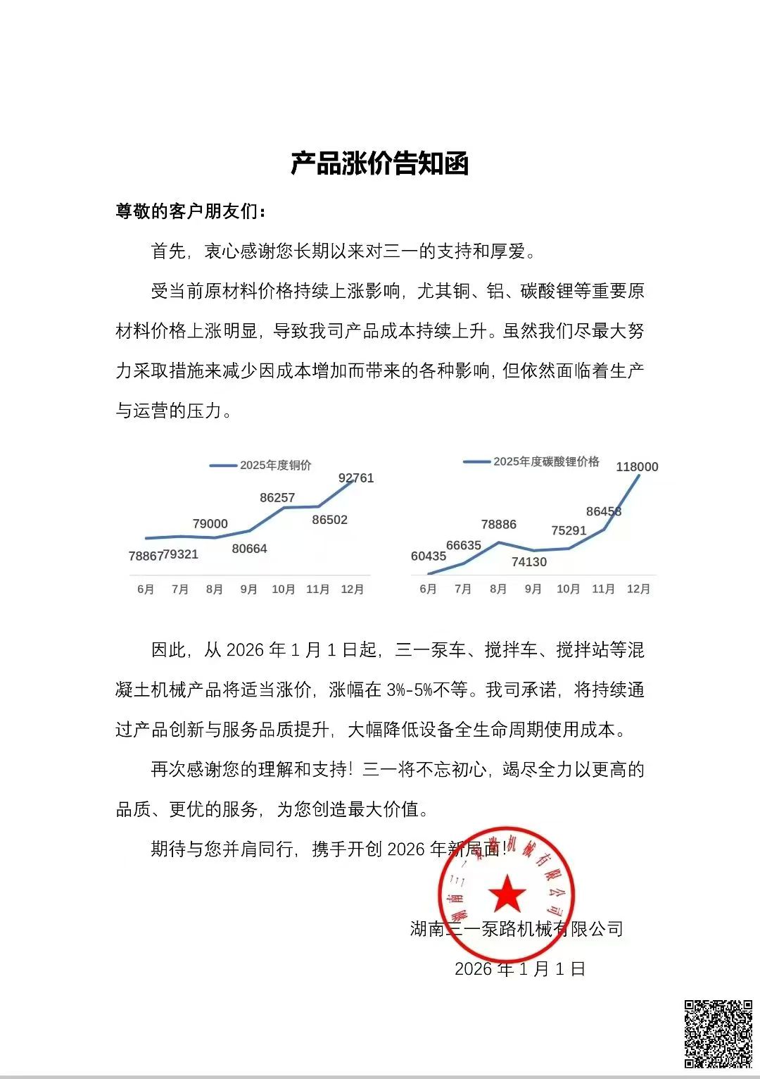近日,湖南三一泵路机械有限公司发布《产品涨价告知函》,宣布自2026年1月1日起,对泵车、搅拌车、搅拌站等混凝土机械产品进行价格上调,涨幅区间为3%-5%。
