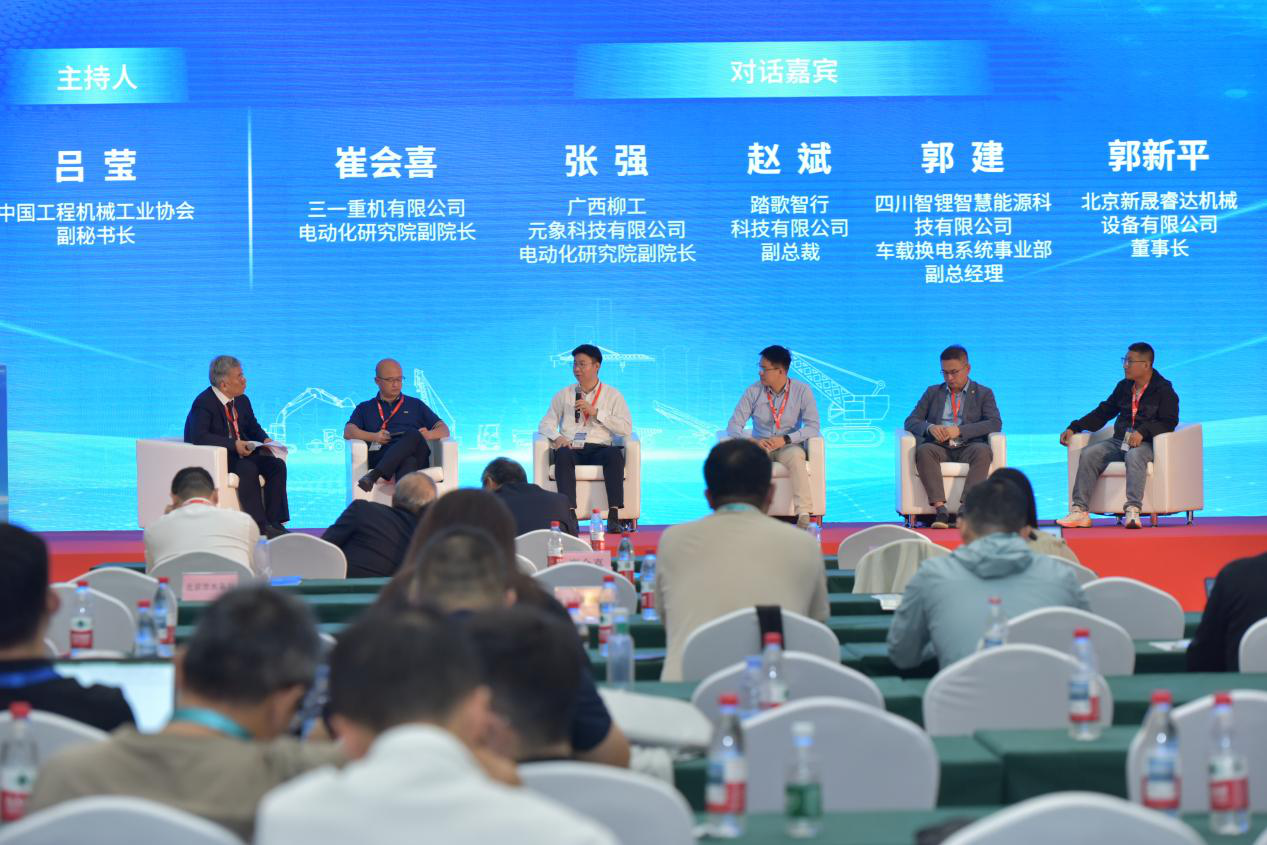 高端对话环节由中国工程机械工业协会副秘书长吕莹主持,来自三一重机有限公司电动化研究院副院长崔会喜、广西柳工元象科技有限公司电动化研究院副院长张强、踏歌智行科技有限公司副总裁赵斌、智锂物联科技有限公司副总经理赵宇、北京新晟睿达机械设备有限公司董事长郭新平等企业代表围绕政策导向、技术突破、产业链协同与国际合作等热点议题展开深入交流。