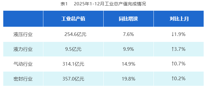 1-12月行业工业销售产值完成1031.0亿元,同比增长14.0%,比上月下降1.1个百分点,其中:液气密行业产值完成935.1亿元,同比增长14.5%,比上月下降0.1个百分点。分行业情况: