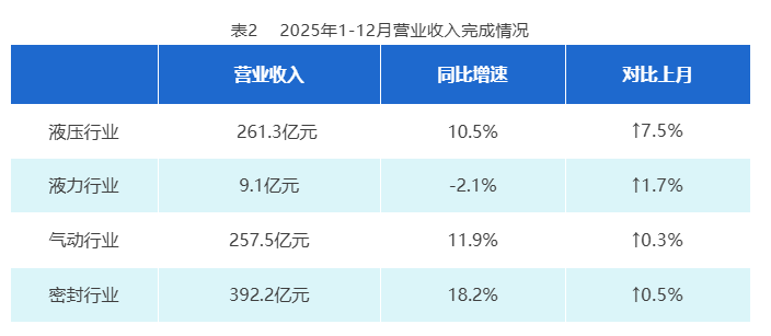 1-12月行业完成979.4亿元,同比增长13.6%,比上月增长0.6个百分点,较机械工业高7.6个百分点。其中:液气密行业收入完成920.2亿元,同比增长13.9%,比上月增长2.8个百分点。分行业情况: