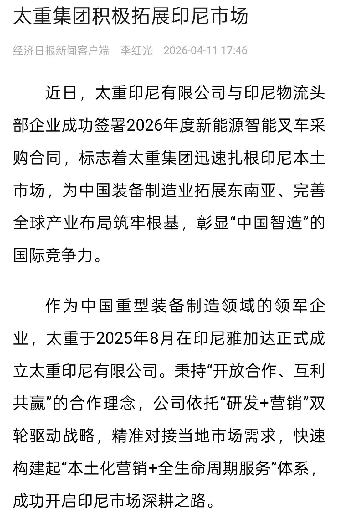 近日,太重印尼有限公司与印尼物流头部企业成功签署2026年度新能源智能叉车采购合同,标志着太重集团迅速扎根印尼本土市场,为中国装备制造业拓展东南亚、完善全球产业布局筑牢根基,彰显“中国智造”的国际竞争力。