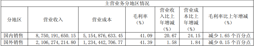 2025年,恒立液压国内营收87.50亿,占总收入的79.98%;国外销售收入21.06亿,占总收入的19.25%。国内市场与海外市场的毛利率相差无几。